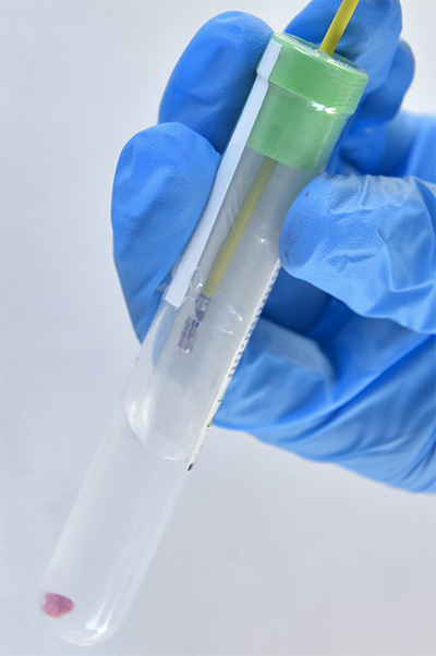 The cap is made of a special polymer, engineered to allow the biopsy instrument to pass through and insert the sample directly into the tube.