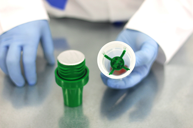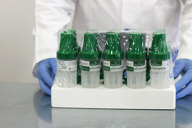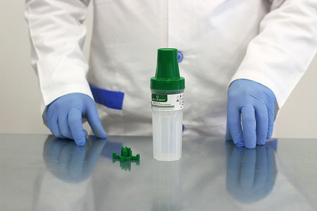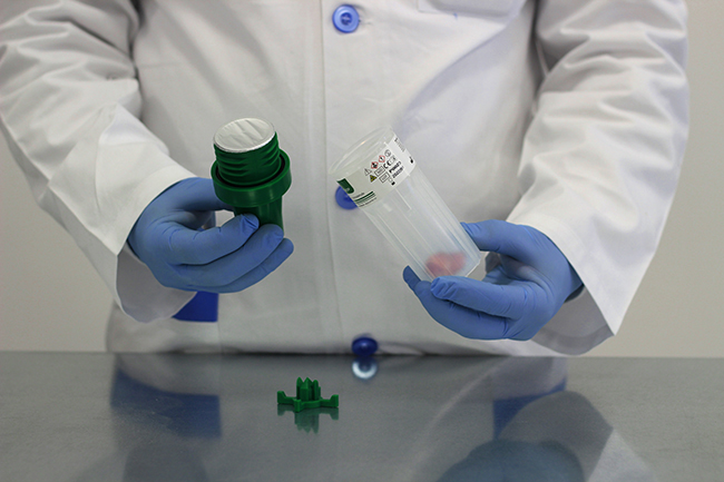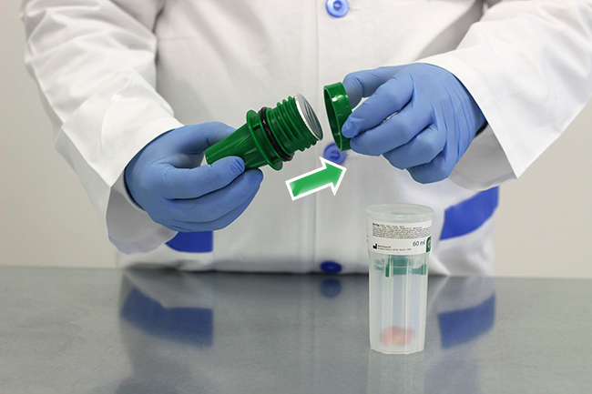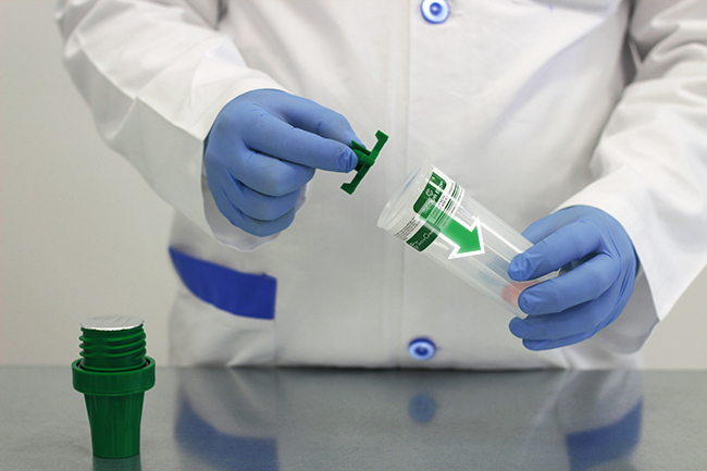 It is simple to use: open the container and remove the safety ring, then insert the sample into the empty cup without coming into contact with formaldehyde—neither vapor nor liquid.