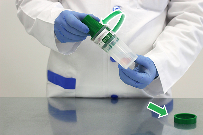 The cap is pre-filled with 10% neutral buffered formalin and sealed with a resistant membrane.