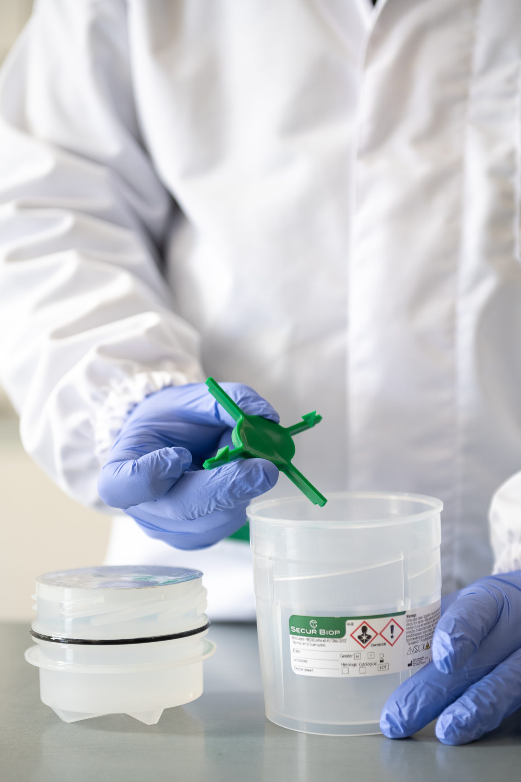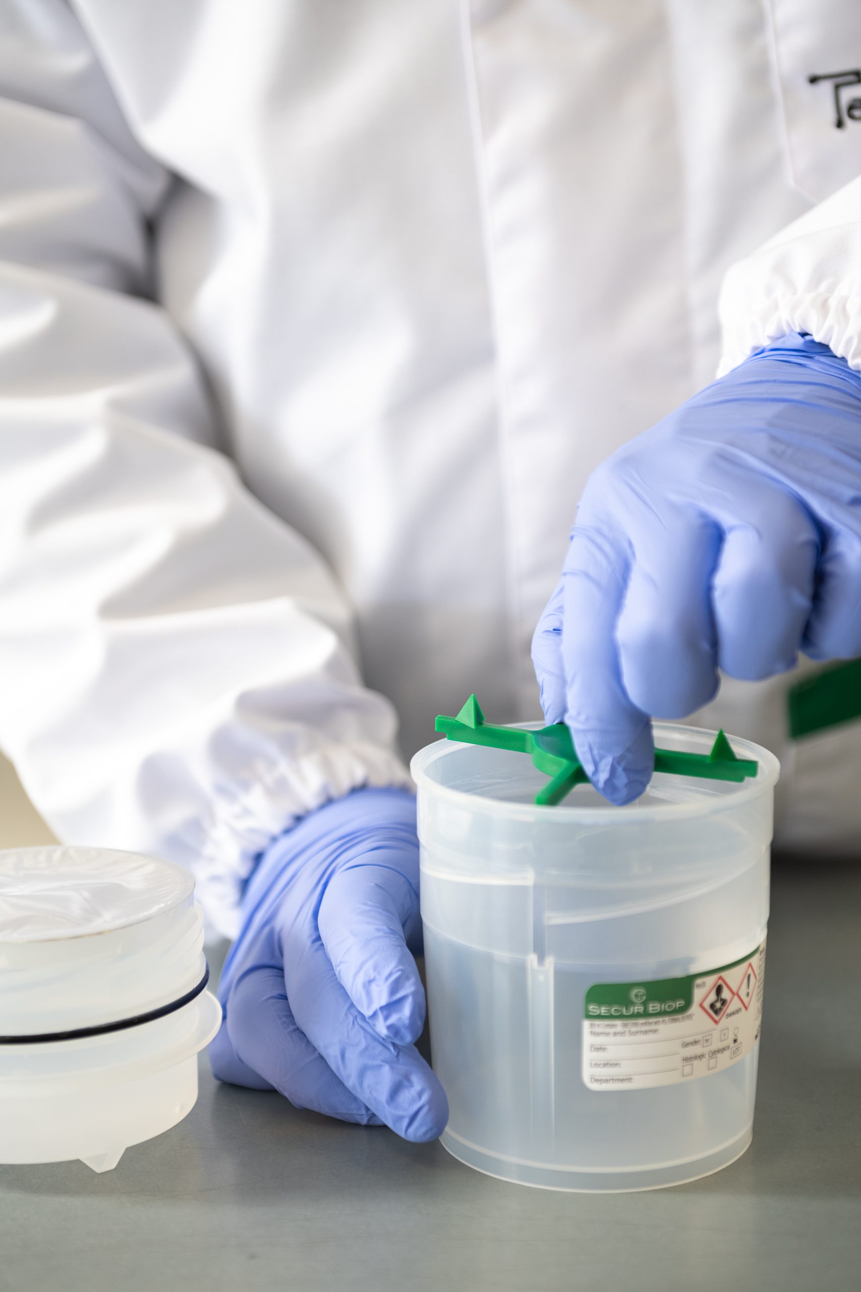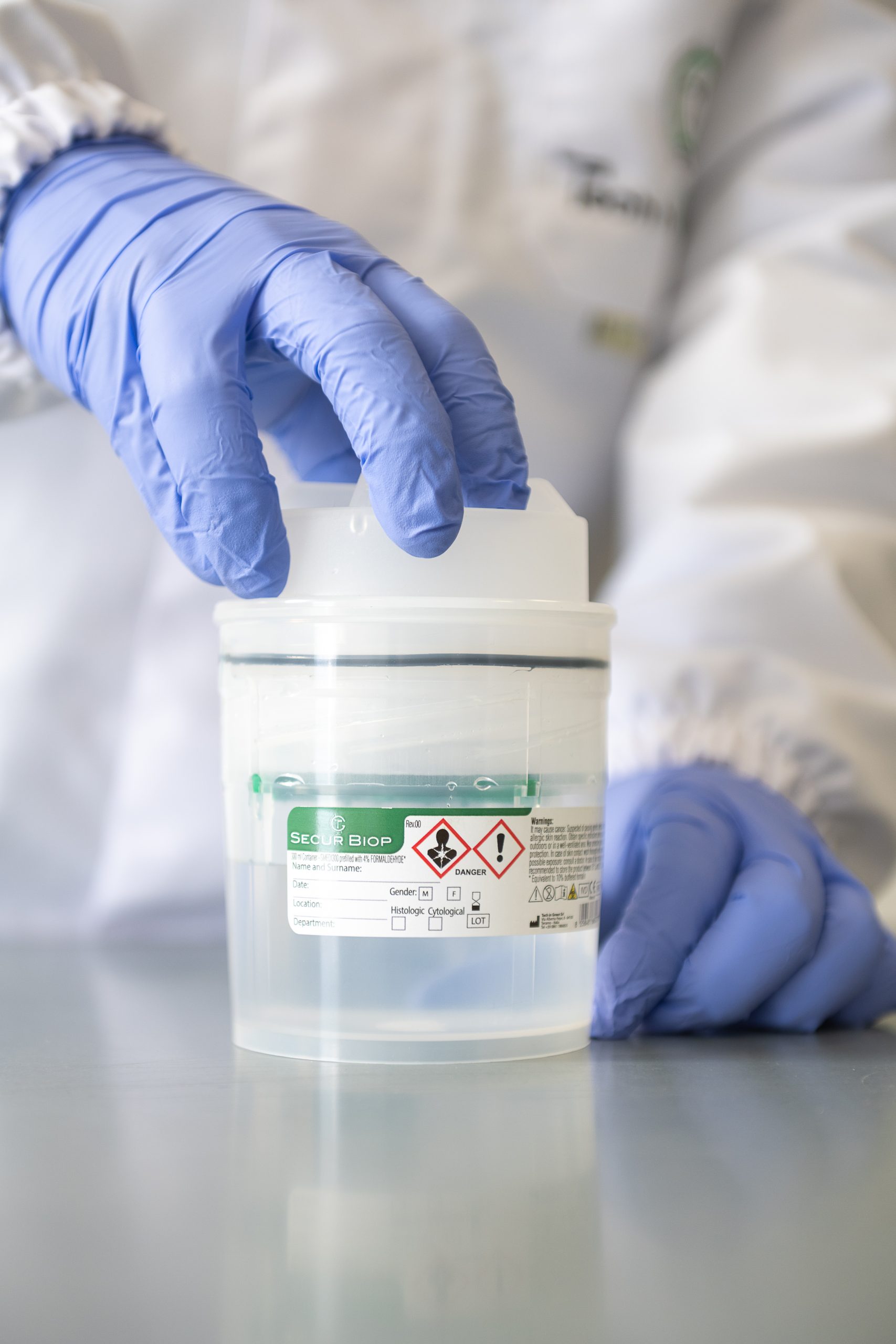 It is easy to use: open the container and remove the perforator, then insert the sample into the empty cup without coming into contact with formaldehyde (neither vapor nor liquid). Once the sample is placed, position the perforator with the tips facing upwards and close the cap. When the container is sealed, the membrane will break, releasing the formalin required for sample fixation. The airtight closure prevents contact with both formalin vapors and liquid and is ensured by an O-ring integrated into the cap.