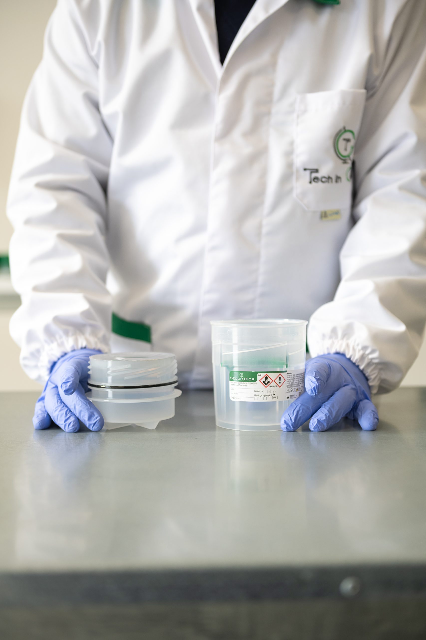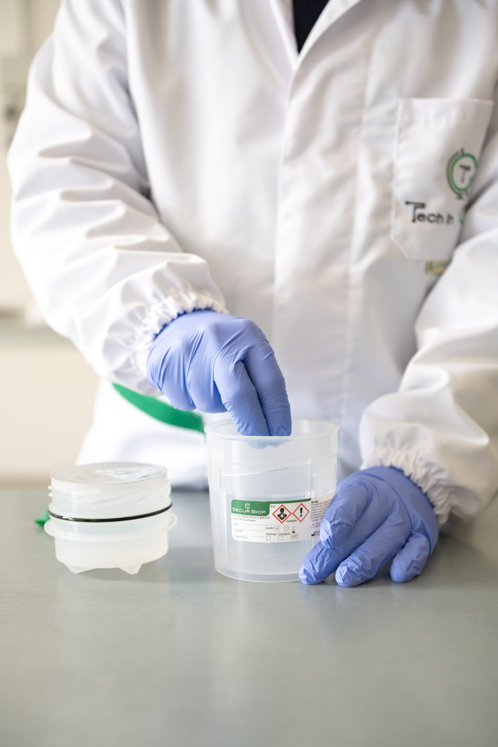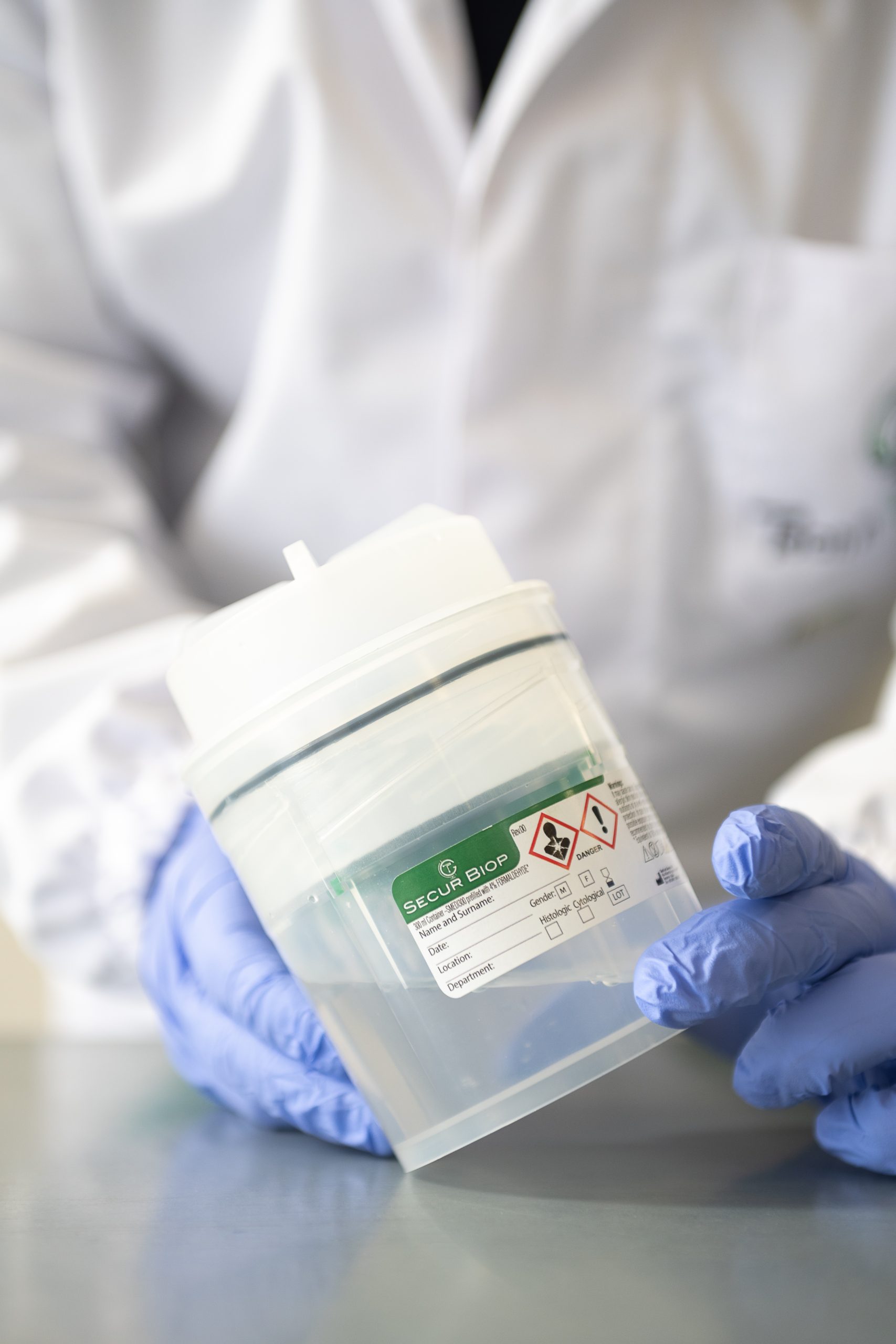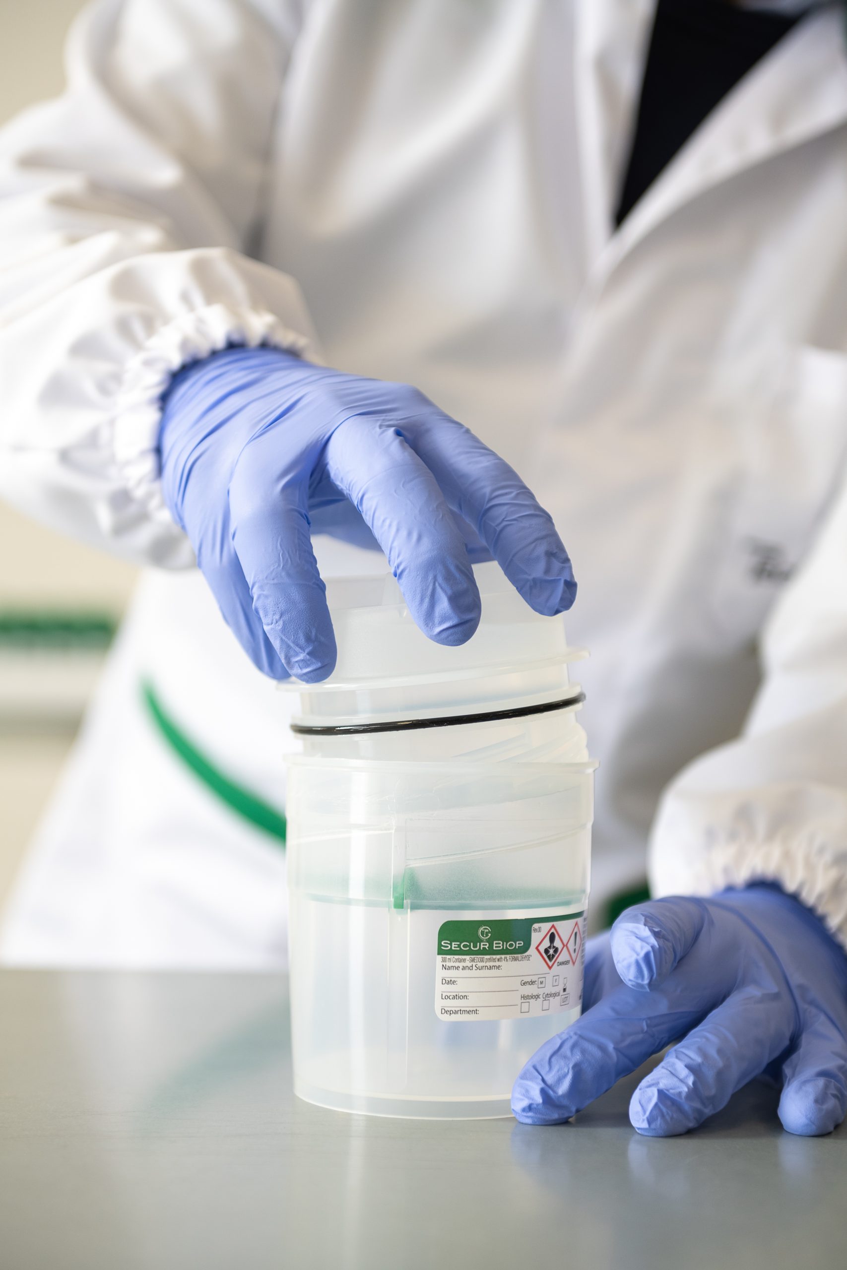 It is easy to use: open the container and remove the perforator, then insert the sample into the empty cup without coming into contact with formaldehyde (neither vapor nor liquid). Once the sample is placed, position the perforator with the tips facing upwards and close the cap. When the container is sealed, the membrane will break, releasing the formalin required for sample fixation. The airtight closure prevents contact with both formalin vapors and liquid and is ensured by an O-ring integrated into the cap.