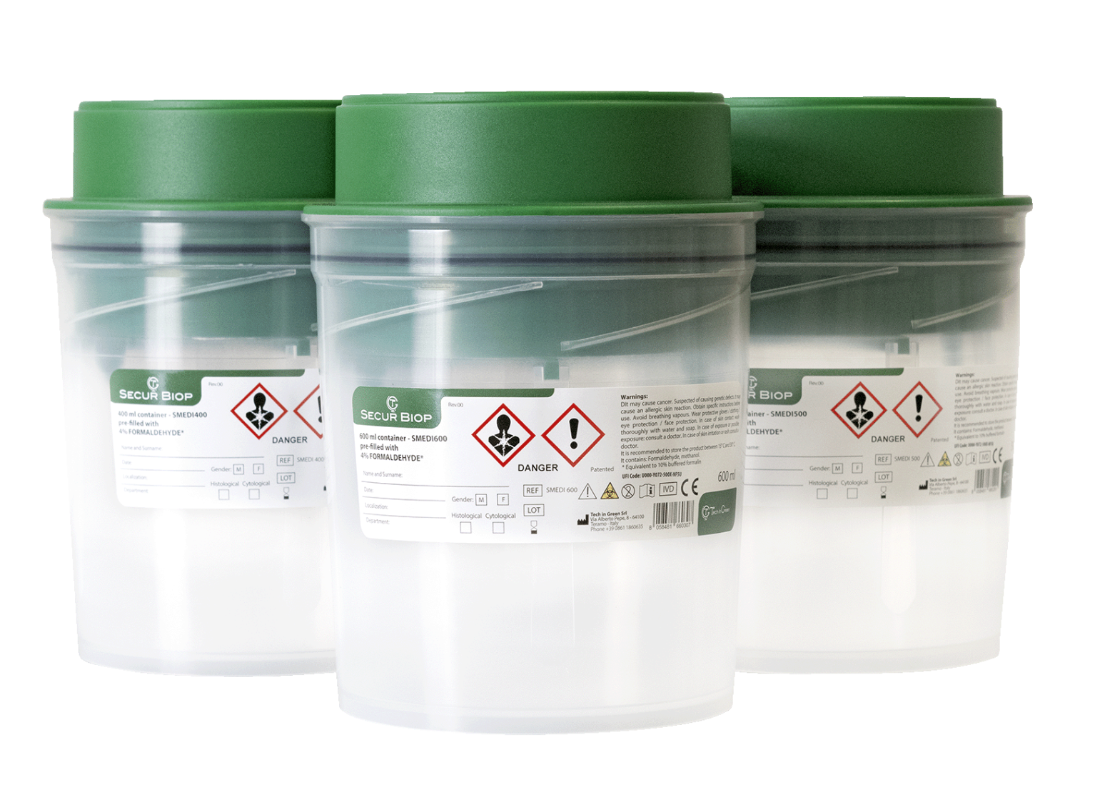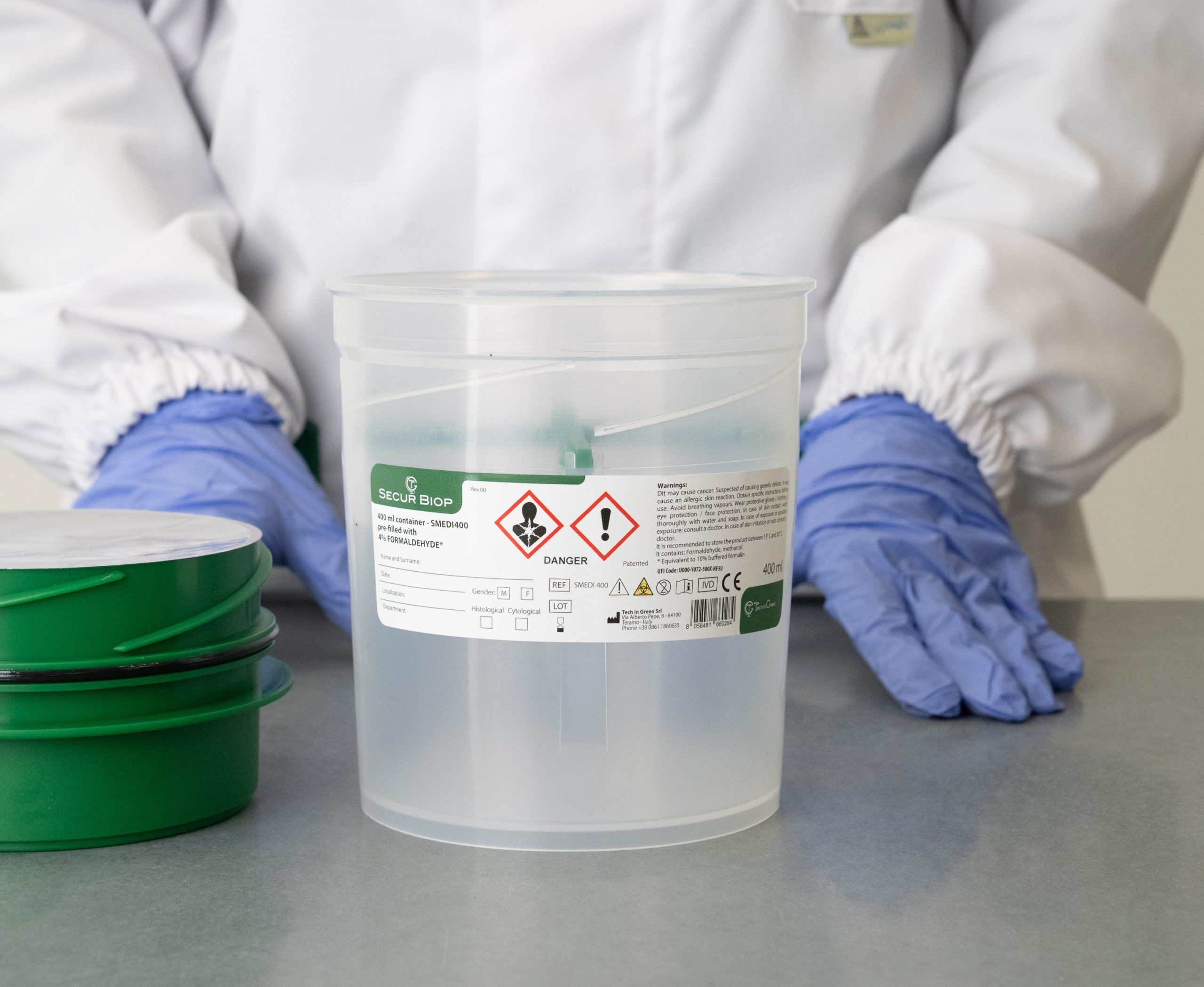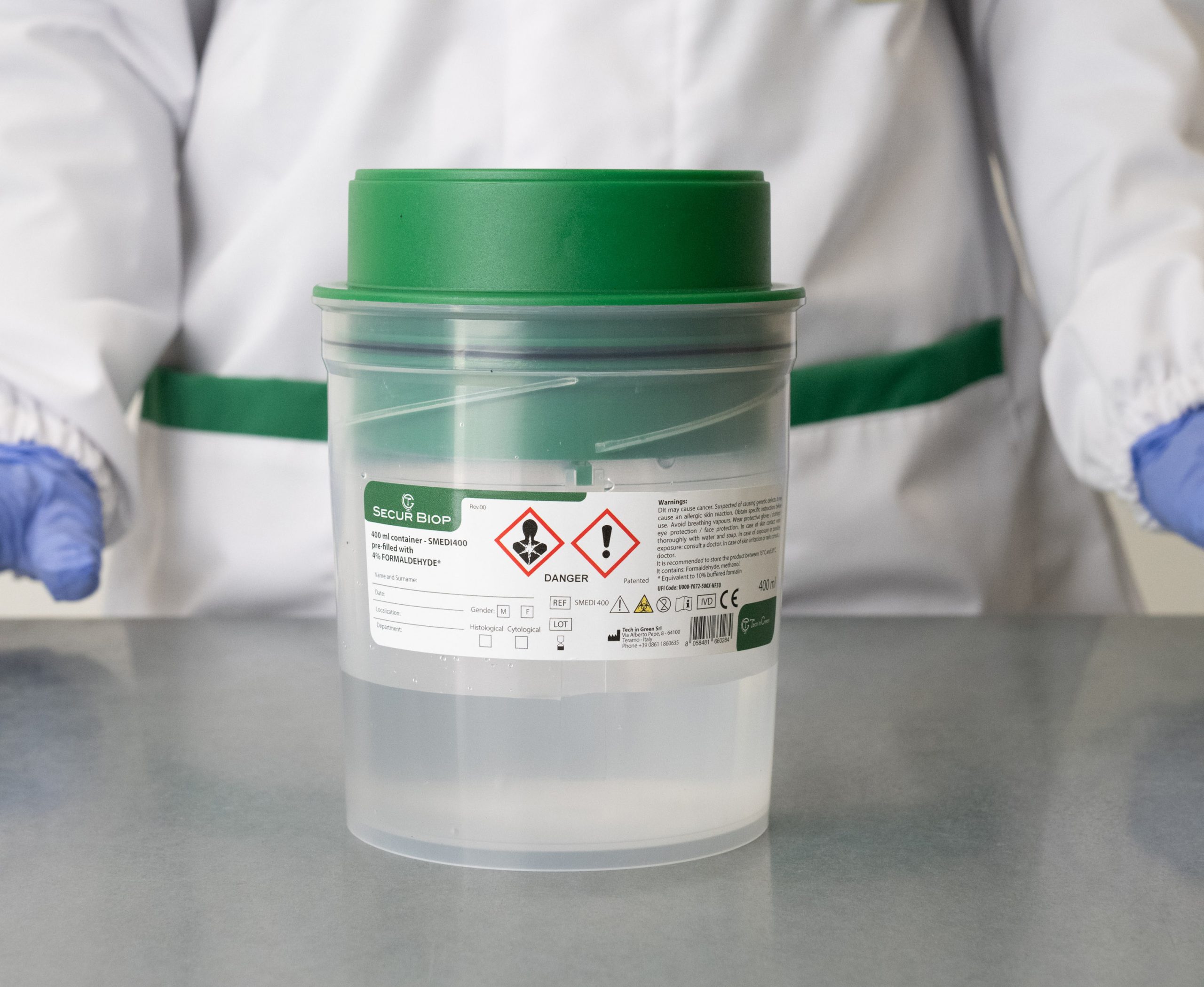 The cap is pre-filled with 10% neutral buffered formalin and sealed with a resistant membrane.