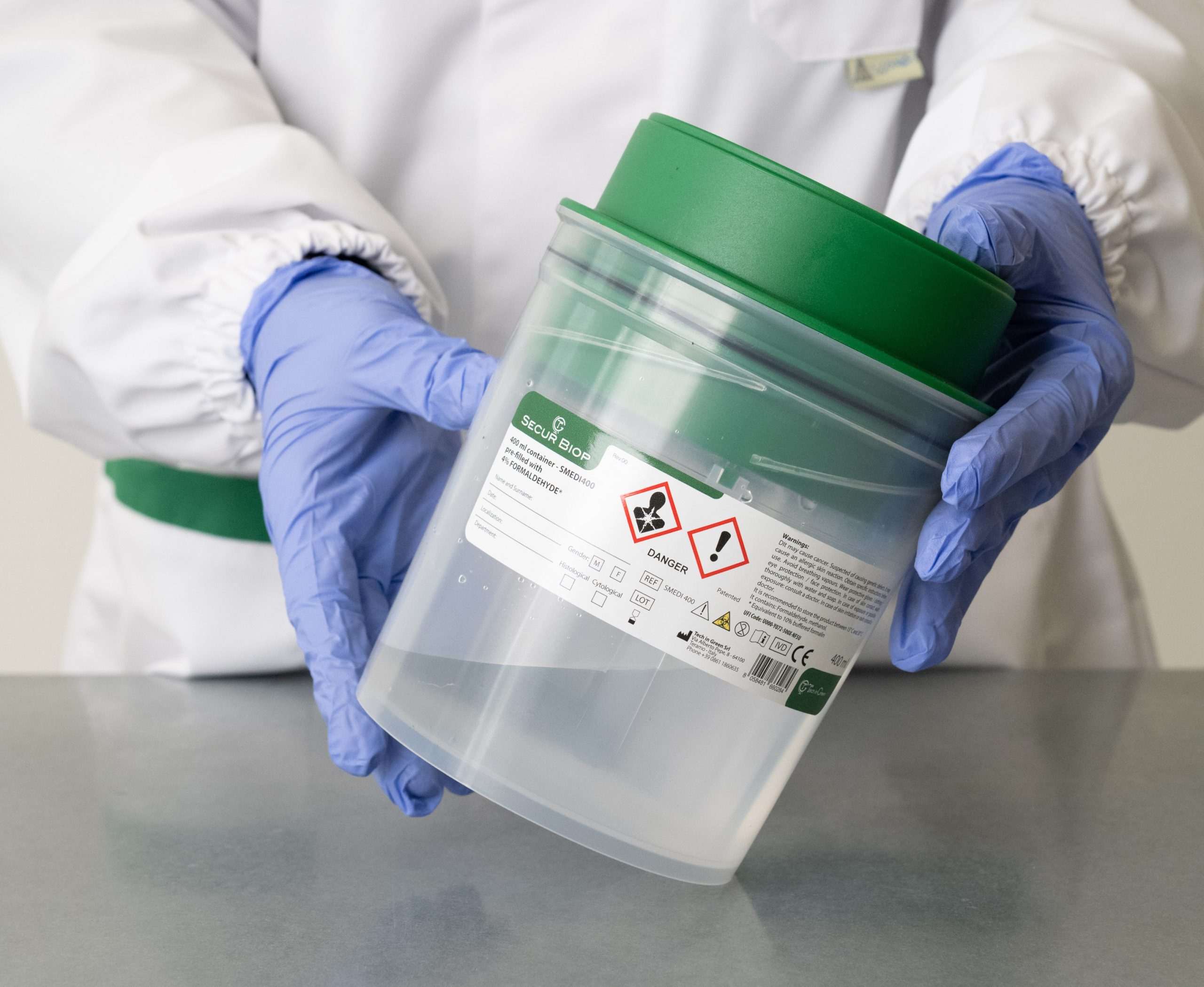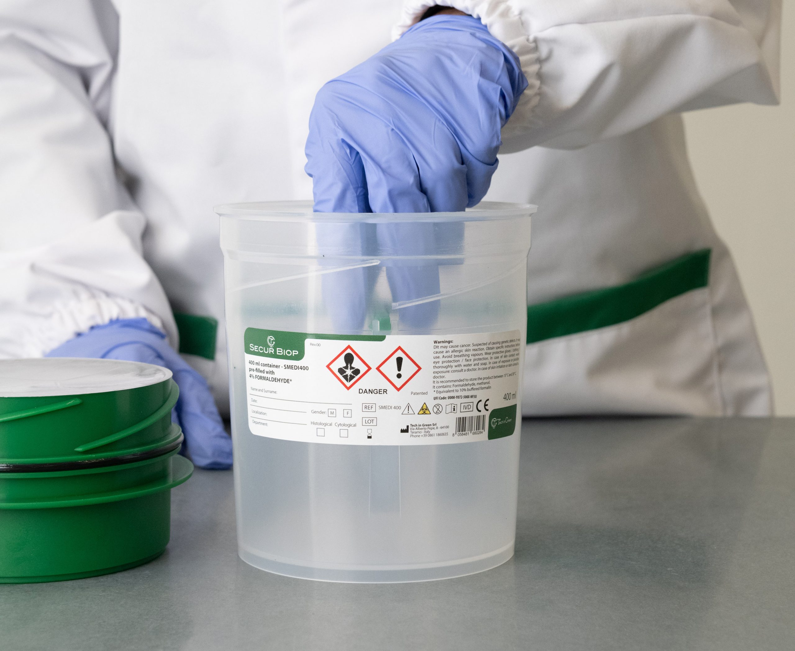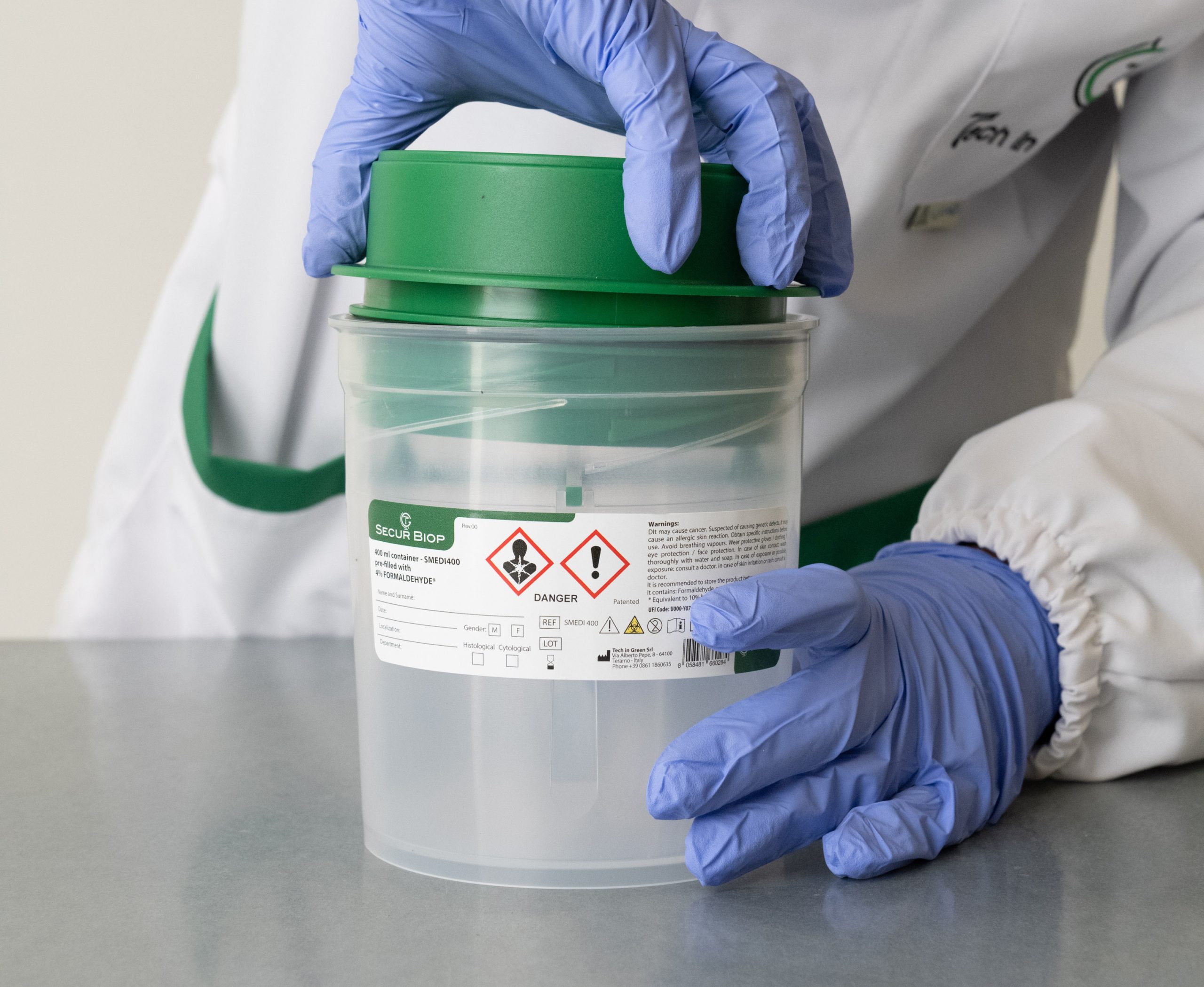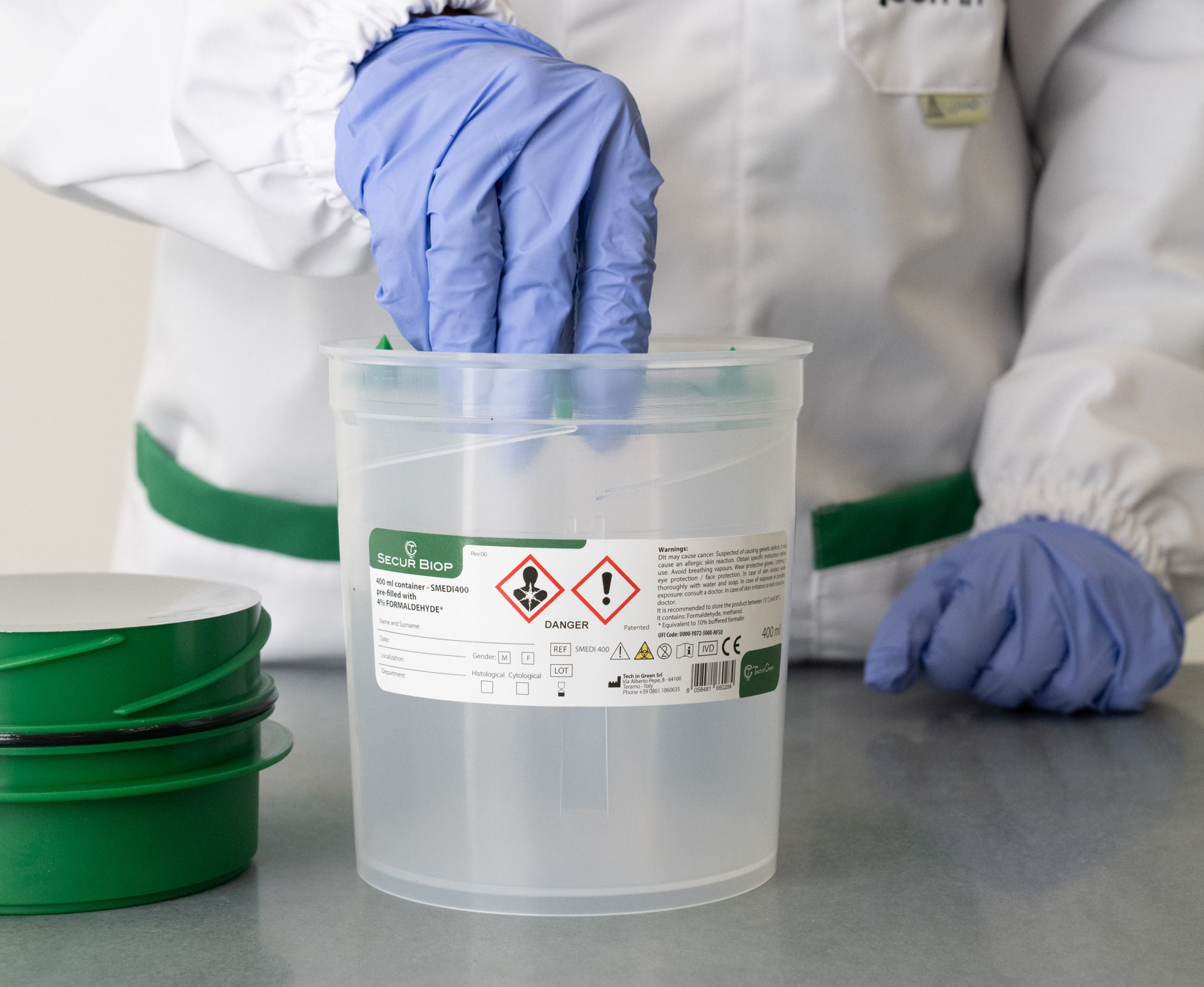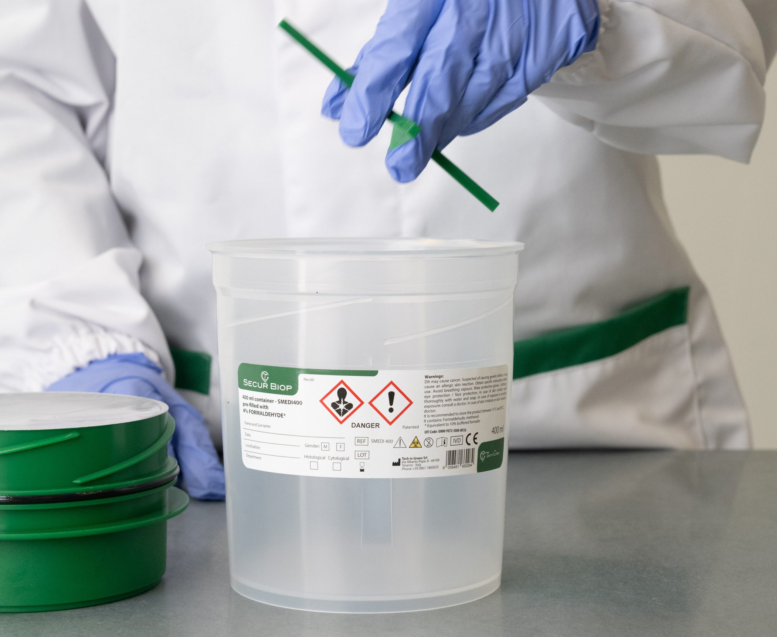 It is easy to use: open the container and remove the perforator, then insert the sample into the empty cup without coming into contact with formaldehyde (neither vapor nor liquid).